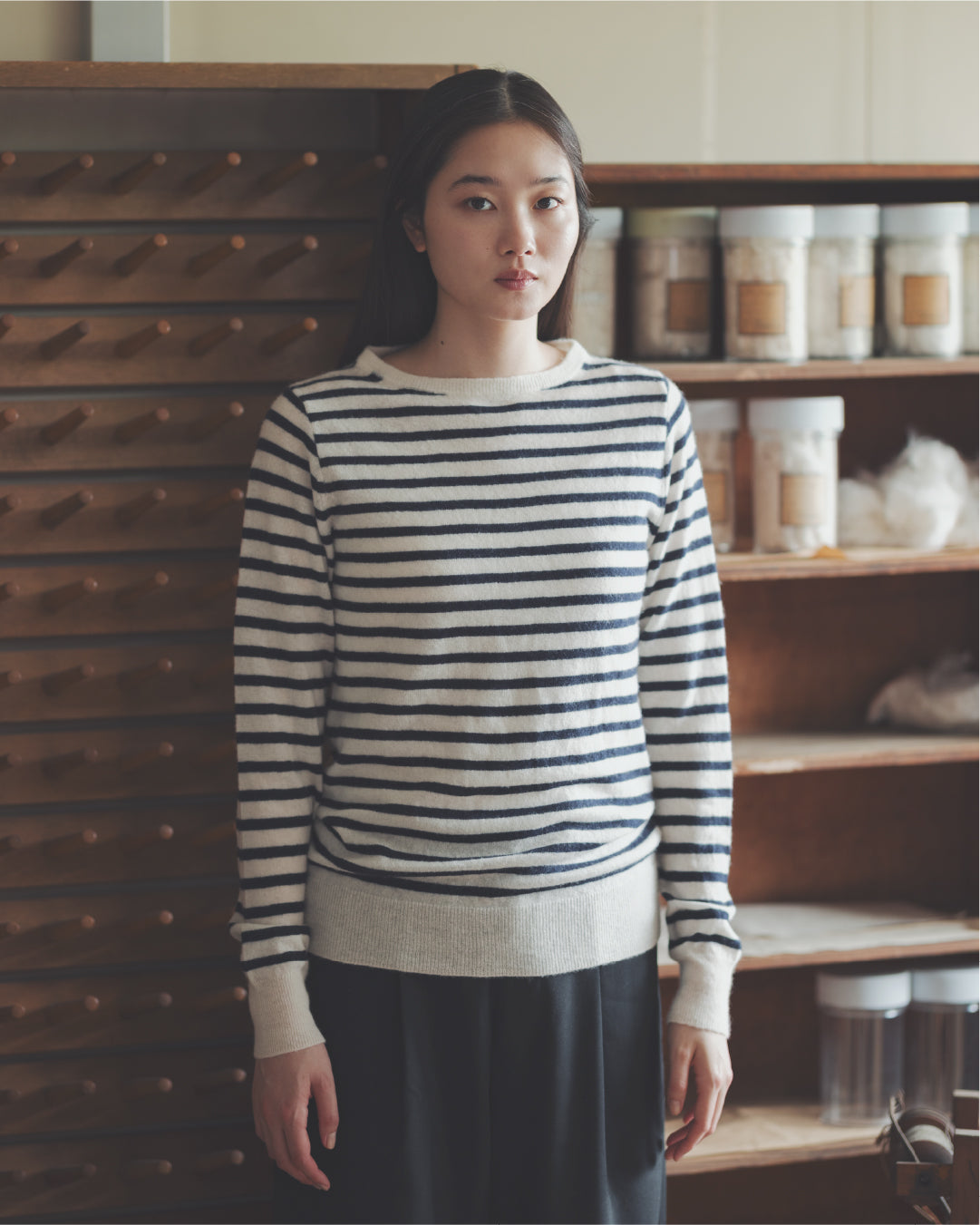 身体のラインを拾いすぎないシルエットが上品な印象をつくり、シンプルな装いに抜け感を添える、大人のためのボーダーニットです。