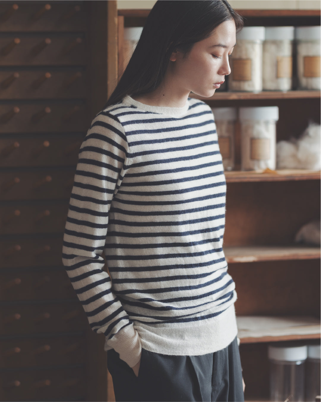 こちらのニットは「スーパーファインソフトカシミヤ」を、一本の糸=単糸で丁寧に編み上げています。本来なら単糸は編み進むにつれて斜行する性質がありますが、独自の技術によりそれを防ぎ、素材本来のしなやかさと軽やかさを最大限に引き出しました。