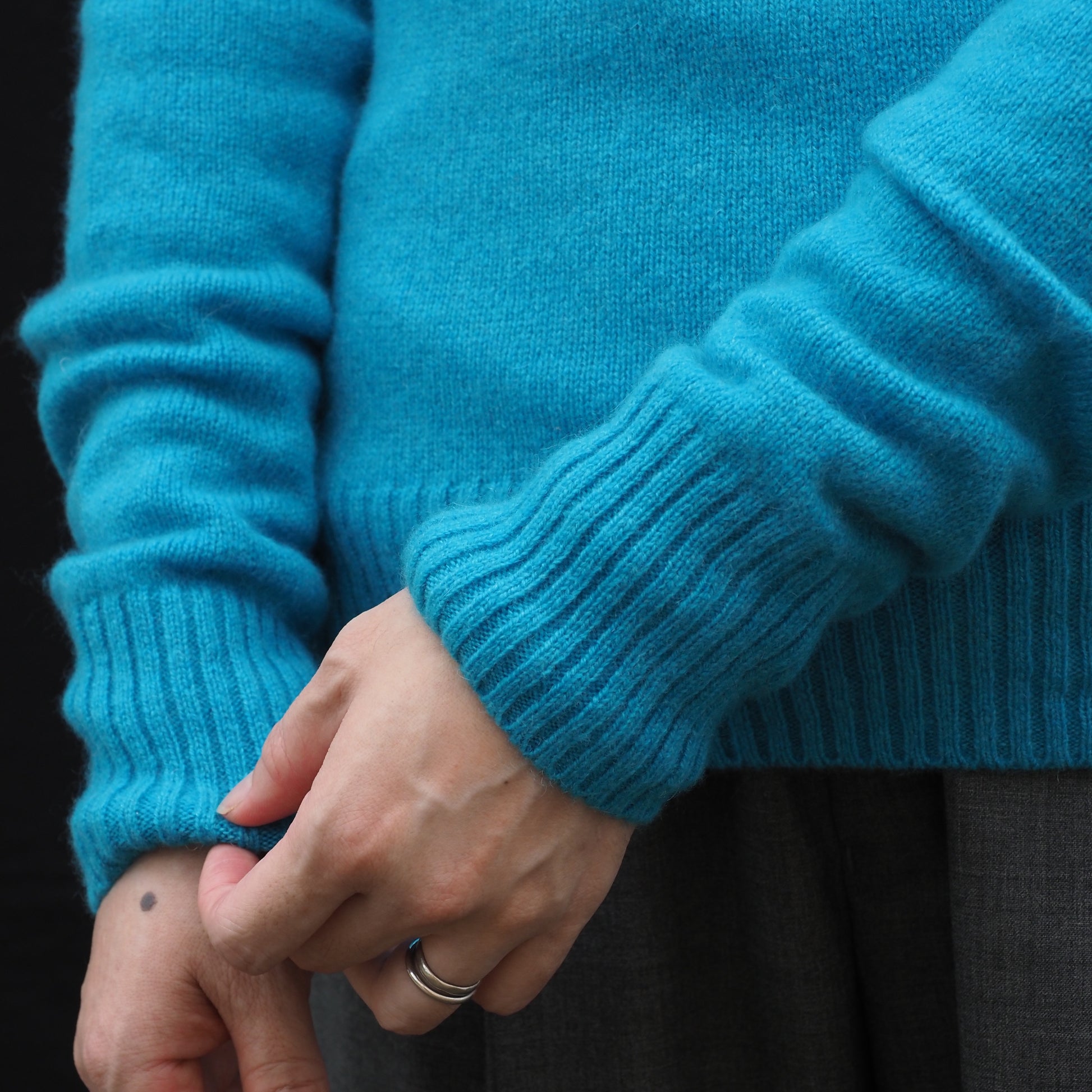 カシミヤの繊維は羊毛などの他の天然繊維に比べて表面が非常に滑らかで、水に濡れても繊維同士が絡みにくく、縮みやフェルト化が起こりにくい特性を持っています。つまり、デリケートな素材でありながらも、美しい風合いを長く保ちやすいのがカシミヤの魅力のひとつ。適切なお手入れをすれば、シルエットや肌触りを損なうことなく、永くご愛用いただけます。